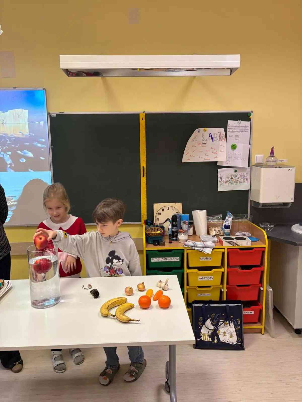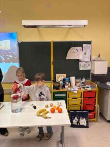 Vērojām, ar kādu spēku griežas balerīna, basketbola bumba un vingrošanas riņķis. Vēl katrs varējām ar kociņa palīdzību iegriezt papīra lapu. Pētījām, kā uz augļiem iedarbojas gaiss. Visaizraujošāk bija pašiem radīt lietu. No bārdas putām izveidojām mākoni, tajā ielējām zilo krāsu. Tik interesanti bija skatīties, kā šai mākonī veidojās pilieni un radās lietus lāses!