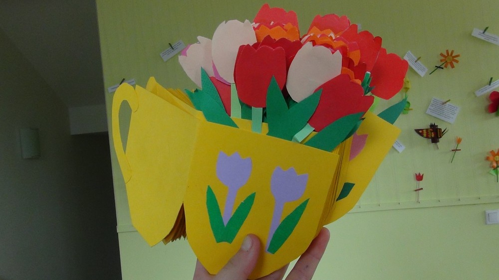 Kartiņas tika pagatavotas jau iepriekš, kopā apmēram 40, bet kēksiņus mēs cepām dienas centrā – netālu no „Ziedugravām”, un to bija ap 120 – katram iedzīvotājam. Kartiņās bija rakstīts saulains sveiciens par pavasara iestāšanos un nu jau drīz gaidāmajām Lieldienām.