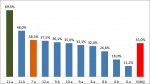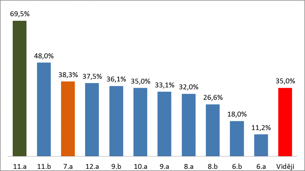 Atskatoties uz aivadīto mācību gadu, var secināt, ka viena no sākotnēji nemīlētajām, bet laika gaitā iemīļotām aktivitātēm ir “Aktualitāšu konkurss”. Turpinot lieliskās konkursa tradīcijas, arī šogad 6.-12.klašu skolēniem tiek piadāvāta iespēja sacensties zināšanās par aktuālajiem jautājumiem ekonomikā, politikā, kultūrā, sportā, izglītībā un citās jomās kā Latvijā, tā pasaulē. Konkursā piedalījās 170 skolēni, pārstāvot 12 klases! Ar prieku paziņoju, ka septembra pirmajā konkursā ar 21.5% izrāvienu ir uzvarējusi 11.a klase! Savukārt 2.vieta – 11.b, bet 3. vieta – 7.a klasei! Pārējo klašu rezultāti redzami diagrammā!