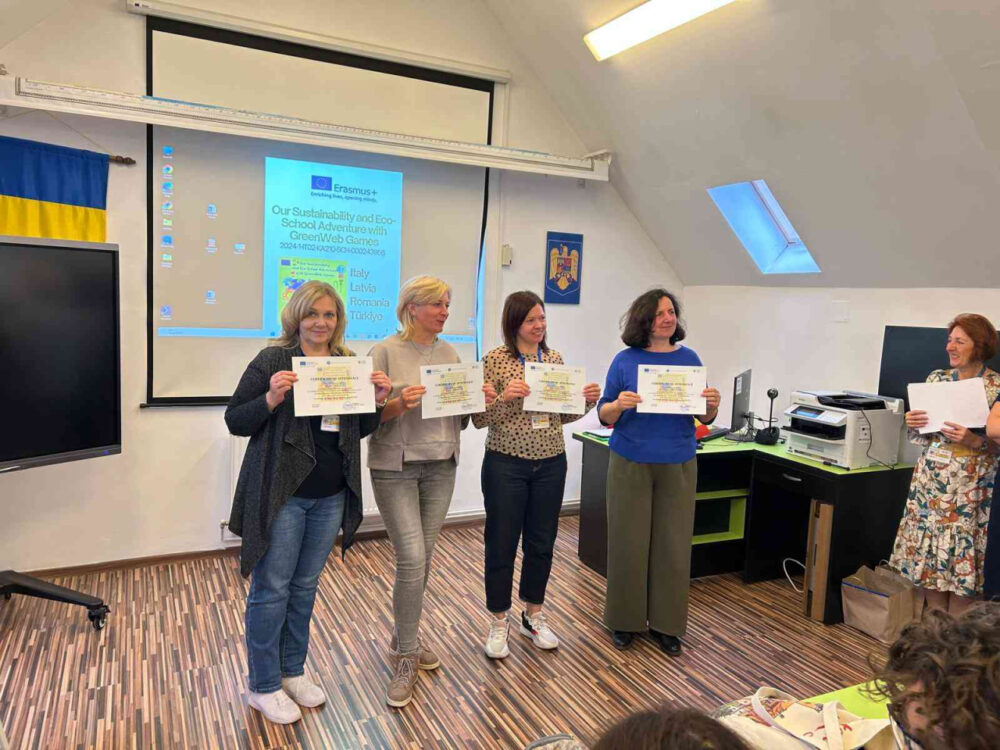 Laikā no 20.-24.oktobrim viesojāmies Ghimbavas vidusskolā, kurā tikāmies ar skolas skolotājiem, administrāciju un skolēniem. Skolotājiem bija iespēja piedalīties mācību stundās un vērot āra nodarbības, kurā skolēniem apguva zināšanas par Rumānijas ekosistēmu, dzīvniekiem un vidi sev apkārt. Kādā no dienām skolēni prezentēja iepriekš izstrādātu, apjomīgu projektu, kurā, izdzīvojot stāstu, bērni no atkritumiem radījuši tēlus un pasaku vidi tiem apkārt. Tādejādi akcentējot, ka ne viss, ko uzskatām par atkritumiem, tiešām tāds arī ir. Ieguldot izdomu un radošumu, var izveidot neticamas lietas. Savukārt skolotāji prezentēja dažādas eko tiešsaistes spēles, kurās iekļautas izzinoša un izglītojoša rakstura aktivitātes. Tika izmēģināta arī virtuālo briļļu izmantošana, mācību satura apgūšanā.