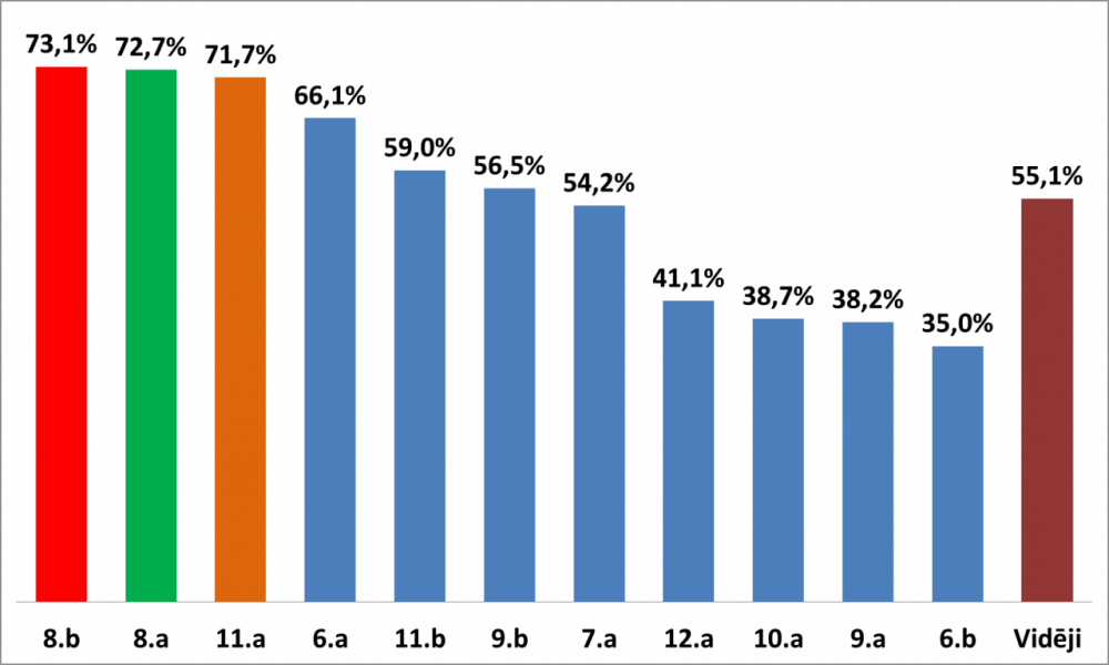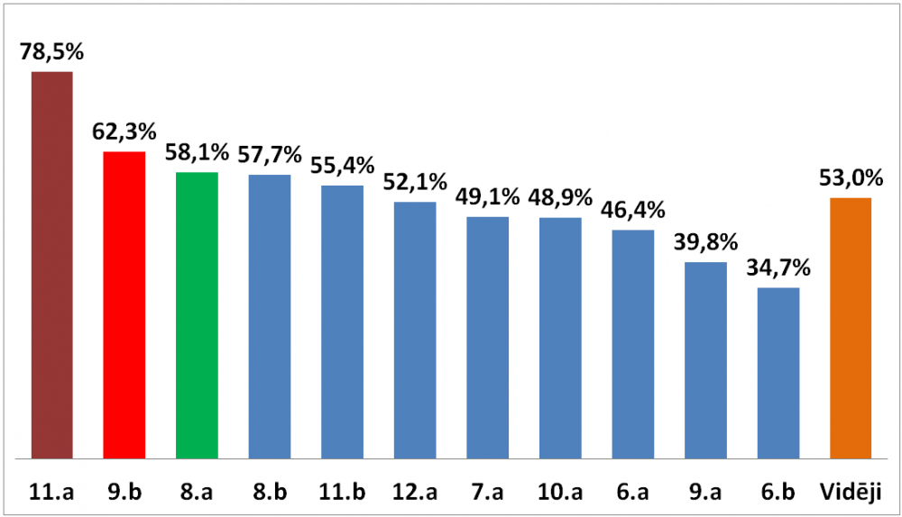 Savukārt apskatot kopējos novembra mēneša rezultātus, vēlos sirsnīgi sveikt 11.a klasi ar iegūto 1., 9.b klasi ar iegūto 2. un 8.a klasi ar iegūto 3.vietu! Pārējo klašu rezultāti redzami diagrammā. Apsveicu uzvarētājus! Skolēnu individuālais sniegums ir pieejams skolas vēstures kabinetā gan par 4.nedēļas konkursu, gan par novembra mēnesi kopumā. Tiekamies jau nākamajā konkursā – jau nākamajā nedēļā.
