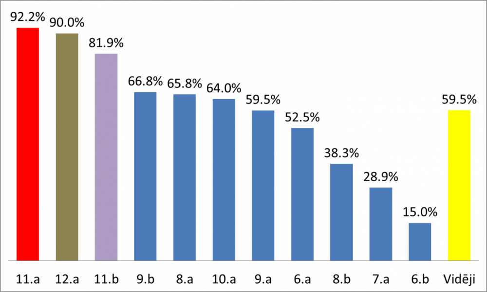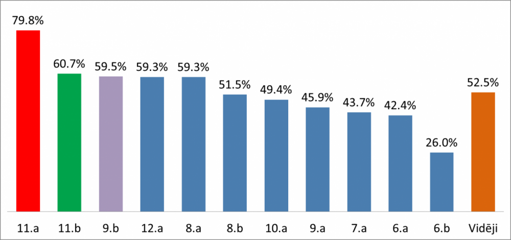 Aizvadīts I semestris ne tikai aktīvā mācību, bet arī ārpusstundu darbā, kur jāizceļ arī aktualitāšu konkurss. I semestra laikā aizvadīti 13 konkursi, kuros katrā vidēji piedalījušies 171.2 skolēni, pārstāvot 11 klašu kolektīvus; 6 konkursos skolēniem tika sagatavoti jautājumi, bet 5 – skolēni paši sniedza savu vērtējumu par aktuālajām norisēm Latvijā vai pasaulē. I semestra kopējie rezultāti redzami diagrammā. Apsveicu 11.a klasi ar godpilno I vietu, tāpat prieks par 11.b klasi ar iegūto II vietu un 9.b klasi ar iegūto 3.vietu!