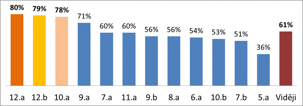 Savukārt mēneša kopējie rezultāti rāda citu ainu – uzvarētāji gan ir tie paši – 12.a klases skolēni – bet pārējā vietu sadalījumā gan ir izmaiņas. Jāuzslavē divi skolēni, kuri šajā mēnesī uzrādīja augstāko rezultātu – visos četros konkursos – 100% izpildes rādītāju! Kopskats uz mēneša sasniegumiem redzams diagrammā!