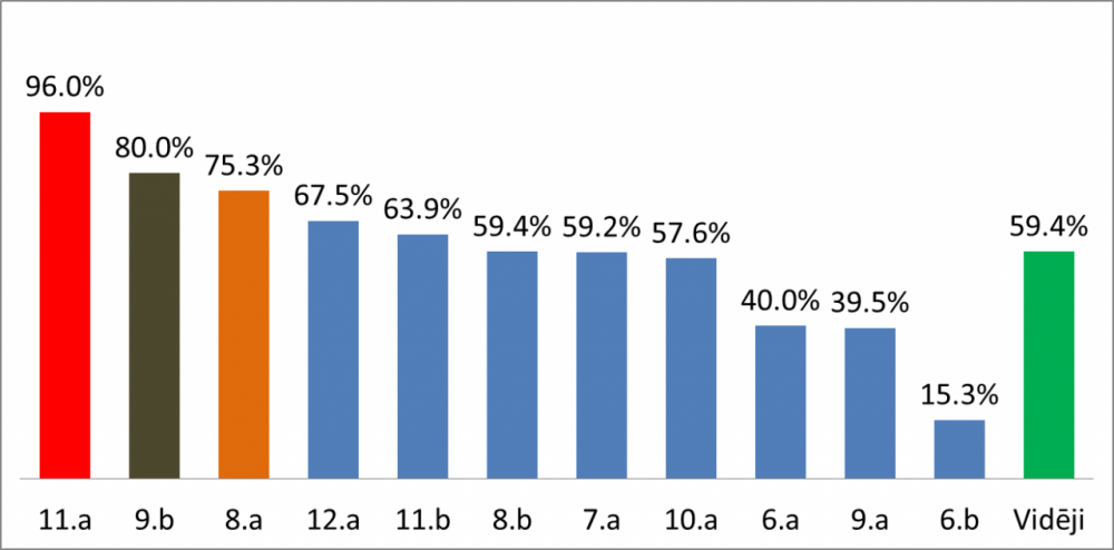 Februāra mēnesis nav izņēmums – turpinās aktualitāšu konkurss, kurā piedalās 6.-12.klašu skolēni. Apkopojot februāra 2. un 3. konkursu rezultātus, redzam interesantus rezultātus – ir notikusi līderu maiņa 3.nedēļā, bet vidējais rādītājs visām klasēm – joprojām virs 50%! 2.nedēļā īpaši jāizceļ 11.a klase (I vieta, izpilde – 96%). 9.b klase (II vieta, izpilde – 80%) un 8.a klase (III vieta, izpilde – 75,3%)! Tāpat jāuzsver, ka 54 skolēni ir ieguvuši maksimālo – 100% rādītāju! Paldies skolēniem par dalību un klašu audzinātājām par ieguldīto darbu, gatavojot skolēnus konkursam! Otrās nedēļas rezultāti redzami 1. diagrammā!