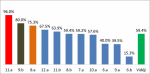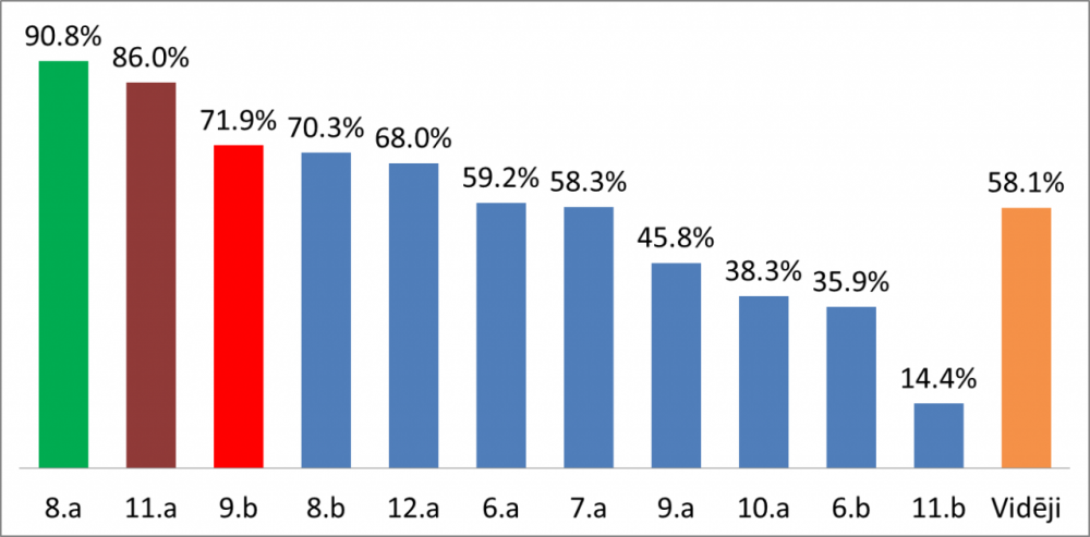 Kā jau minēju, 3.nedēļa ir ar patīkamu pārsteigumu – līderu maiņu – I vieta 8.a klasei, kura pārspēja vairāk kā 2 mēnešus nepārspētos līderus – 11.a klasi (šajā konkursā – II vieta, izpilde – 86%). Godpilnā 3.vieta – 9.b klasei (izpilde – 71,9%). Tāpat jāuzsver, ka 38 skolēni ir ieguvuši maksimālo – 100% rādītāju! Pārējos rezultātus 3. nedēļā var aplūkot 2.diagrammā!