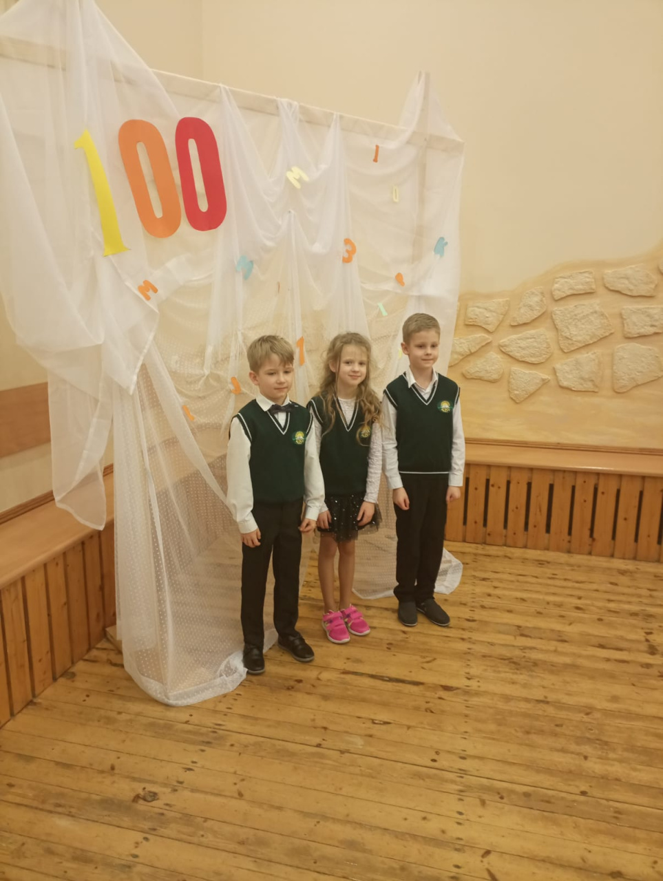 Paldies 1.klašu audzinātājām Laumai Riekstiņai, Evitai Štauerei mūzikas skolotājai Ivetai Biķerniecei, angļu valodas skolotājai Inesei Levinskai, ritmikas skolotājai Marutai Mīlīgai par ieguldīto darbu, lai šis 100. dienas svētku mirklis mūsu pirmās klases skolēniem kļūtu neaizmirstams.