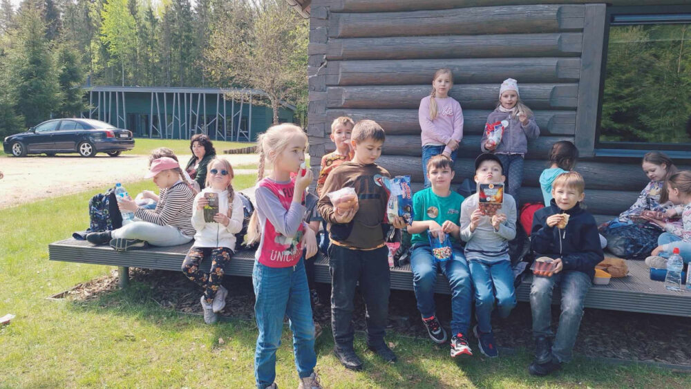 Noslēgumā visi kopā baudījām gidu Ineses un Normunda sarūpēto ugunskuru. Skolēni cepa desiņas, ieturēja pusdienu maltīti, kā arī izmantoja piedāvāto iespēju – katram iestādīt eglīti.