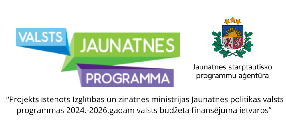 Projekts tiek īstenots Izglītības un zinātnes ministrijas jaunatnes politikas valsts programmas 2024.-2026.gadam valsts budžeta finansējuma ietvaros. Pateicamies Valsts jaunatnes programmai un Jaunatnes starptautisko programmu aģentūrai par iespēju!