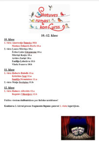Žūrija, kuras sastāvā bija skolas direktore Ieviņa Piļka, direktores vietniece Liene Sola, skolotājas Vija Meroža, Daina Vancāne-Viļuma, Aija Zvaigznīte, Santa Krasovska, piešķīra godalgotas vietas visiem dalībniekiem. Bet 21 skolēnam būs jāgatavo prozas fragments konkursa otrajai kārtai tepat skolā. Pēc tās tiks lemts, kuri 1.-12. klašu skolēni 21. martā pierādīs savu talantu un pārstāvēs AUSV Aizkrauklē.