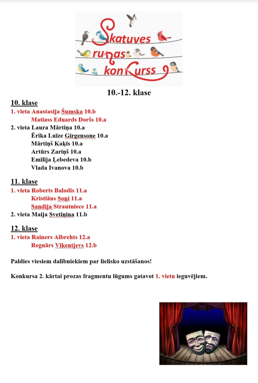 Jāuzteic, ka visi bija ļoti gatavojušies – dzejoļi izvēlēti interesanti, aktuāli, runātājam atbilstoši. Prieks, ka skolēni spēj ne tikai iemācīties dzejoļa tekstu, bet spēt iejusties un izdzīvot saturu, liekot klausītājiem noticēt – jūsmot par skaistumu, pasapņot līdzi vēlmēm, iesmieties par draiskulībām un iestāties par vērtībām.