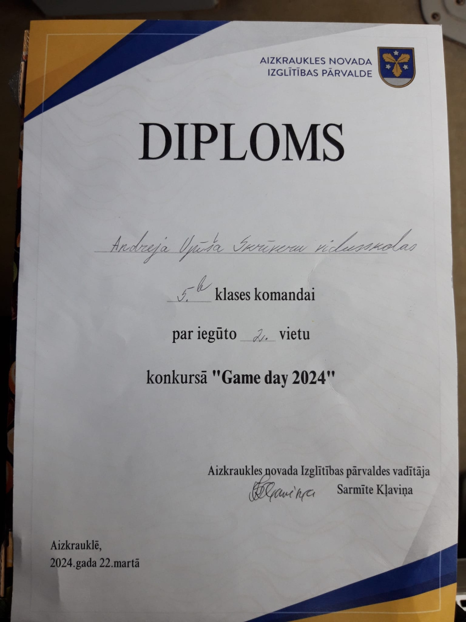 2024.gada 22. martā Andreja Upīša Skrīveru vidusskolas abu 5. klašu skolēni brauca uz Aizkraukli, lai piedalītos angļu valodas konkursā “Game day”. Gan no 5.a, gan 5.b klases tika izvēlēti četri skolēni – Adele Babre, Sabīne Rūze, Sāra Gribute, Raivis Lapiņš no 5.a, un Kinga Ižo, Anna Rubine, Beāte Rikmane un Dominiks Žiško no 5.b. Šie skolēni pārstāvēja skolu, un viņus pavadīja angļu valodas skolotāja Aija Ieleja.
