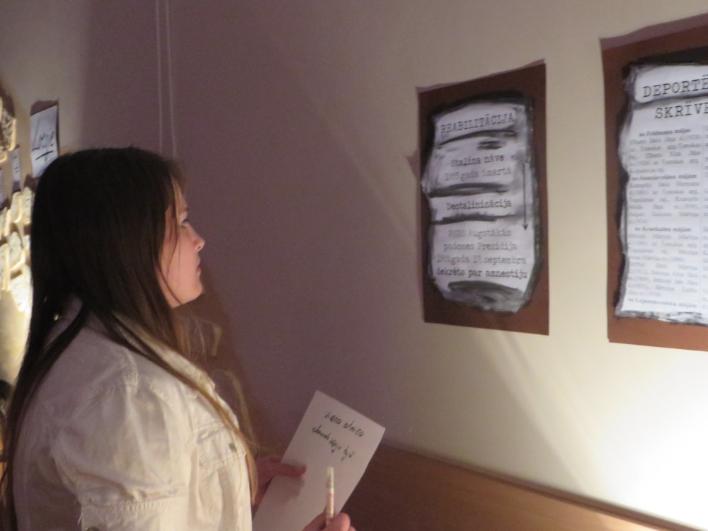 Pieminot 1949.gada deportācijās izvestos un svešumā palikušos, skolēniem, skolotājiem, skolas viesiem un citiem interesentiem skolā visas aizvadītās nedēļas (24.-31.03.2014.) garumā bija iespēja aplūkot izstādi-darbnīcu “Prom no mājām”. Izstādi apmeklēja visas skolas klases, arī skolotāji un Latvijas Represēto apvienības Skrīveru nodaļa. Vēlos izteikt pateicību visiem skolas skolēniem un skolotājiem, kuri apmeklēja izstādi, īpašs paldies 1.-5.klašu audzinātājām, kuras atrada laiku, lai skolēnus atvestu uz skolas aktu zāli, lai iepazīstinātu ar nozīmīgo un skumjo notikumu Latvijas vēsturē. Tāpat paldies skolas dienesta viesnīcas vadītājai M.Burkai par palīdzību rekvizītu sagādē. Būtiski, ka līdz ar vēsturiskā notikuma norišu iepazīšanu, skolēni pilnveidoja arī savu izstāžu apmeklēšanas kultūru.