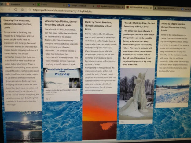 Tradicionāli Baltijas jūras projekta organizatori aicina atzīmēt Pasaules Ūdens dienu ar dažādām aktivitātēm, šogad tās ir citādākas nekā parasti. Mūsu skolēni iesaistījās fotogrāfiju, video un aprakstu veidošanā par ūdens nozīmi. 11. klašu skolēni skolotājas Aijas Ielejas vadībā meklēja idiomas par ūdeni un to tulkojumu angļu valodā, kā arī tiešo tulkojumu . Tekstam tika piemeklēti atbilstoši attēli. Skolēni no 9 dalībvalstīm šos darbus apkopo un ievieto kopīgā saitē, katrs var tos apskatīt un novērtēt.