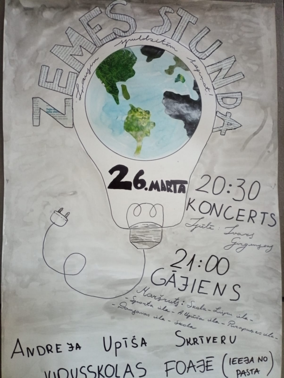 Zemes stundas pasākums norisinājās Andreja Upīša Skrīveru vidusskolas foajē 26. martā no plkst. 20:30 – 21:30 (Zemes stundas laikā). To organizēja EKO padomes skolēni ar skolotāju Danuti Podvinsku.