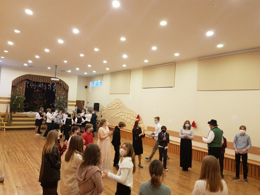 20. un 21. decembrī svētku noskaņojumu centās radīt folkloras kopa ”Burdons” ar Ivetu un Vidvudu Medeņiem. Bija viss: rotaļas, dziesmas mīklas un bluķa vilkšana….Visi nelabumi no skolas tika iesprostoti bluķī un vakarā sadedzināti ugunskurā.