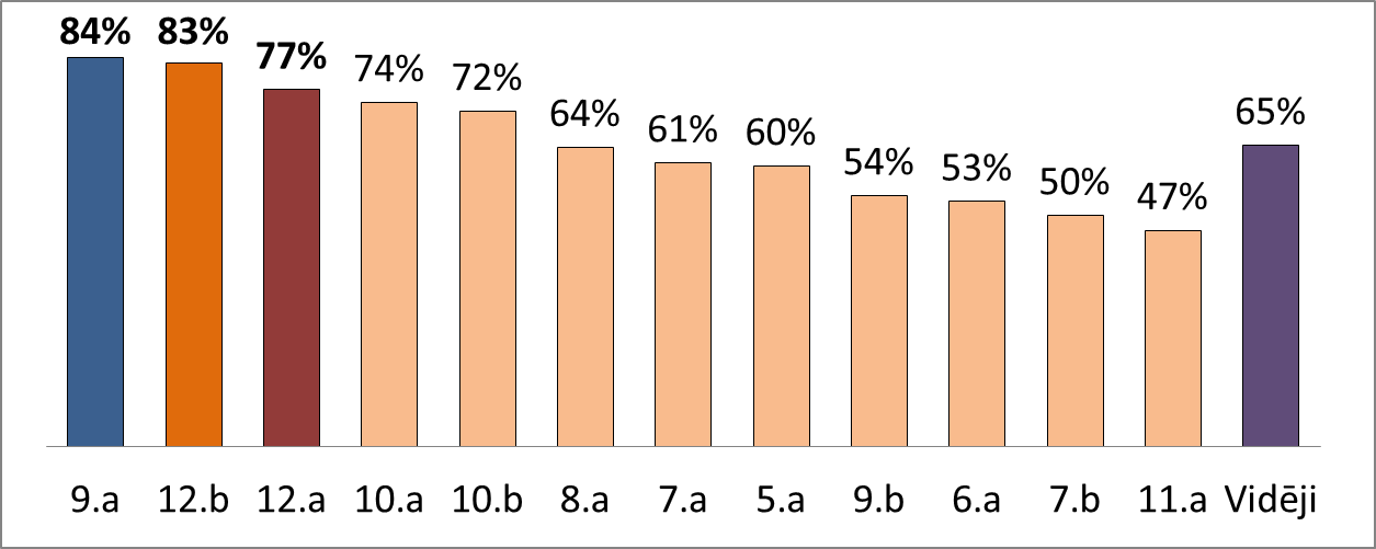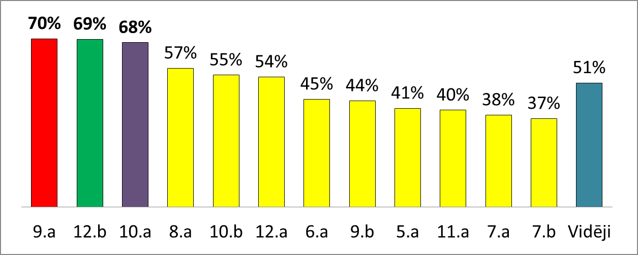 Oktobra kopējie rezultāti ir interesanti. Lai arī vidējais rādītājs, salīdzinot ar septembri, ir krities par 20%, kopējā tendence ir vērsta uz izaugsmi, jo kā 9.a, tā 12.b un 10.a klases nepārprotami cenšas pierādīt savu vietu un vēlmi iegūt erudītākās klases titulu. Nedaudz statistikas. Oktobra mēnesī vidēji konkursos piedalījušies 95% jeb 198 no 208 skolēniem, kas mācās 5.-12.klašu grupās. Maksimālo (100%) izpildes rādītāju vidēji mēneša ietvaros 5.-12.klasēs ir ieguvuši 38 skolēni, no kuriem pamatskolas posmā (5.-9.kl.)- 21, bet vidusskolas posmā (10.-12.kl.) – 17!