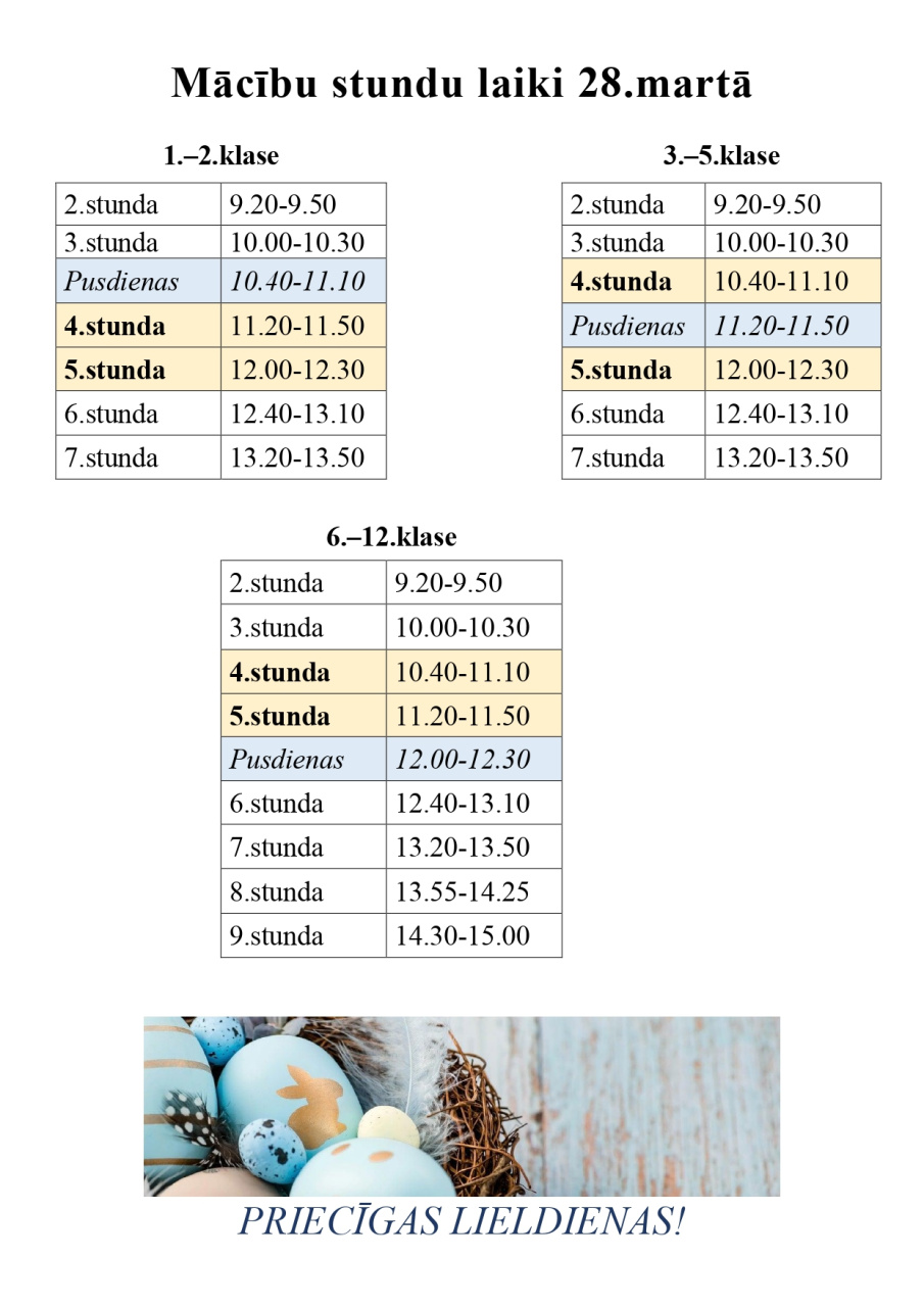 Mācību stundu laiki pirms svētku dienā 28.martā