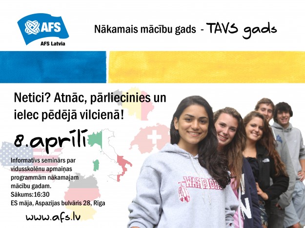 8.aprīlī, pulkst. 16:30, “Eiropas Savienības māja” telpās norisināsies informatīvs seminārs par “AFS Starpkulturu programmas” vidusskolēnu apmaiņas programmām nākamajam 2014/2015. m/g. Seminara gaitā dalībniekiem būs iespēja tikties ar citiem interesentiem, dalīties ar pieredzi un kontaktiem. Pasākuma turpinājumā tiks stāstīta praktiska informacija par programmu valstīm, programmu saturu, dalībnieku kritērijiem un pieteikšanās termiņiem. Semināru apmeklēt aicinām gan jauniešus un to vecākus, gan skolu pārstāvjus/skolotājus iegūt plašāku skatījumu uz apmaiņas programmām un praktisku informāciju. Ludzu, aizpildiet reģistrācijas anketu, ja kāds no skolas plāno apmeklēt semināru!