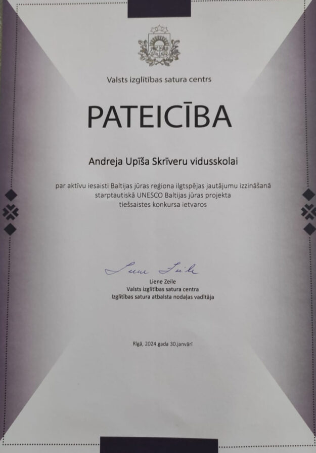 Mūsu skola jau no 2000. gada ir iesaistījusies UNESCO Baltijas jūras projekta darbībā. Šo gadu laikā skolēni ir piedalījušies starptautiskās konferencēs, veikuši darbu vides izpētes programmās, piedalījušies projekta konkursos tādā veidā gan paplašinot savas zināšanas, gan arī uzlabojot angļu valodas prasmes, jo projekta saziņas valoda ir angļu valoda. Tiešsaistes konkursos esam piedalījušies jau apmēram 10 gadus, šogad-2024.gadā tajā iesaistījās 10. a klase, labākos rezultātus uzrādīja Līga Survila un Krista Posnija. Varam būt priecīgi, saņemot ziņu , ka esam aktīvāko skolu skaitā!