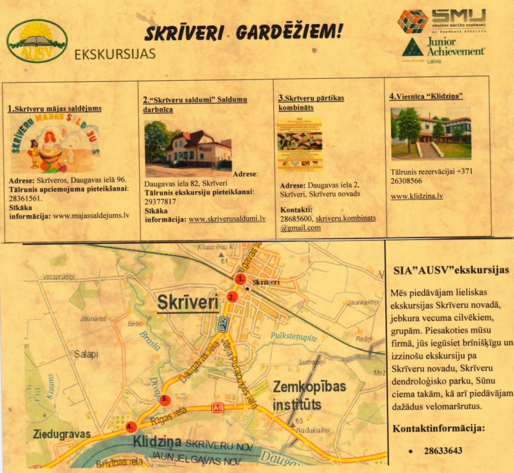 Sestdien, 28.martā, no 9.00- 14.00 Aizkraukles sporta hallē tiek rīkots Skolēnu mācību firmu Lieldienu gadatirgus, kurā piedalīsies Andreja Upīša Skrīveru vidusskolas SIA “AUSV ekskursijas” dalībnieces un prezentēs savu preci – ekskursijas pa Skrīveriem, daudzveidīgus bukletus, konsultācijas par viesošanos Skrīveros un apskatāmajiem objektiem.