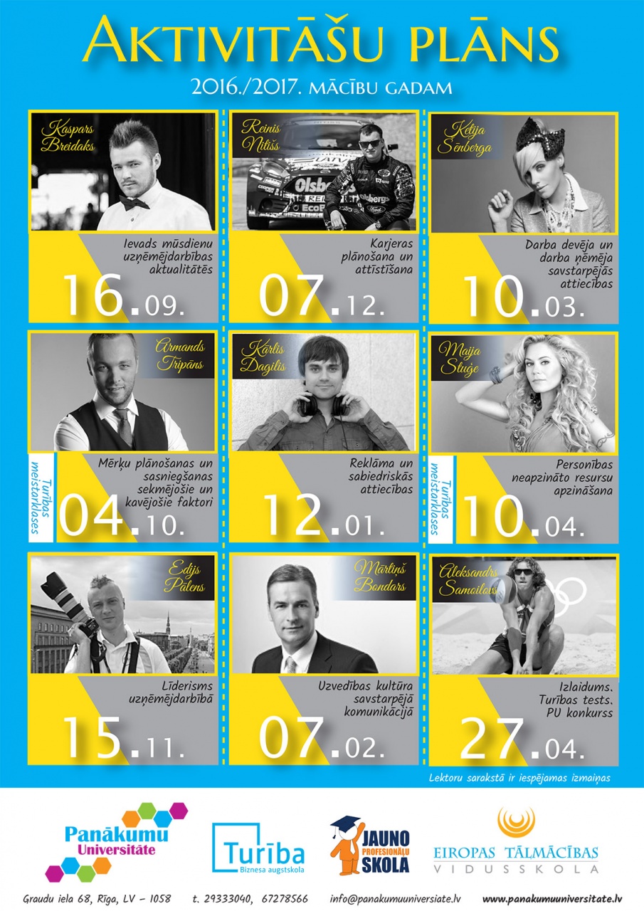 „Panākumu Universitāte” ir uz 6 gadiem akreditēta profesionālās pilnveides izglītības programma jauniešiem, kurā, iepazīstot profesionālu un veiksmīgu personību dzīvi un darba pieredzi, tiek attīstīta un veicināta katra jaunieša individuālā prasme gūt savus personīgos panākumus. Programmas mērķis ir veicināt Tavu zināšanu un prasmju attīstīšanu gan uzņēmējdarbības, gan psiholoģijas un sabiedrisko attiecību jomās, gūstot pieredzi praktiskā darbībā, klātienē tiekoties ar pieredzējušiem un veiksmīgiem uzņēmējiem, politiķiem un kultūras sfēras pārstāvjiem, tādējādi ieinteresējot Tevi iepazīt profesiju daudzveidību un veicinot prasmi gūt savus personīgos panākumus.