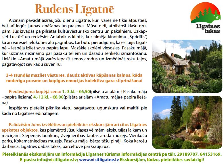 - Ekskursijas uz Līgatni (1 maršruts). Informāciju skatīt šeit!
