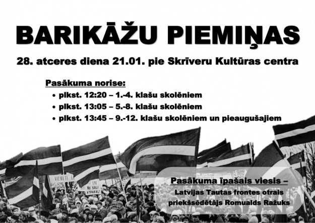 Barikāžu 28.atceres dienai veltītais pasākums notiks pirmdien, 21.janvārī, audzināšanas stundas laikā. Piemiņas pasākuma programmā paredzēta kopīga sildīšanās pie ugunskura, tējas baudīšana, vizuāla ieskata gūšana Barikāžu laika notikumos un tikšanās ar ārstu, Barikāžu laika personību, Latvijas Tautas Frontes otro priekšsēdētāju, Romualdu Ražuku.