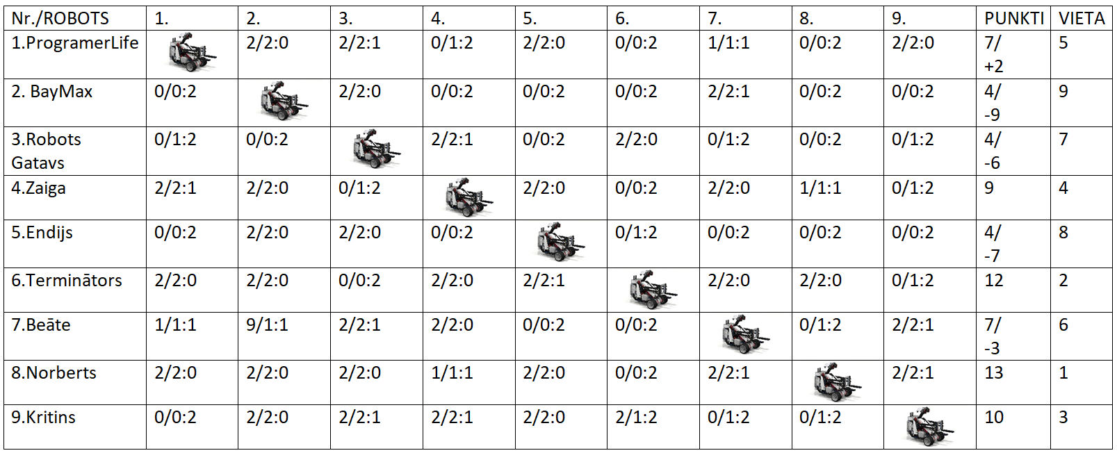 7.decembrī Andreja Upīša Skrīveru vidusskolā tika aizvadīts pirmais LEGO ROBOTIKAS sacensību posms. Uzvaras laurus plūca robots “Norberts”, otrajā vietā palika robots “Terminātors”, kas izcēlās ar rotējošu roku, savukārt godpilno trešo vietu izcīnīja robots “Kritins”. Šajās sacensībās visi roboti bija aprīkoti ar krāsu un ultraskaņas sensoriem. Dalībnieki bija piestrādājuši arī pie robotu dizaina un centušies panākt pēc iespējas lielāku to masu. Paldies par piedalīšanos un gatavojamies nākamajam posmam jaunajā 2019.gadā. Lūk, rezultāti: