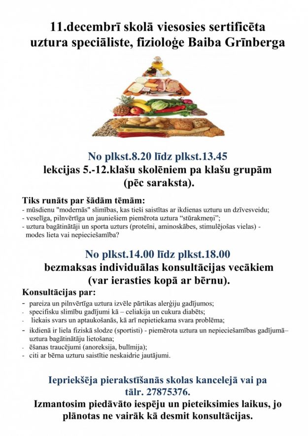 11.decembrī ar skolēniem tiksies uztura speciāliste