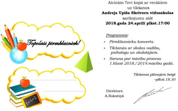 Aicinām topošos pirmklasniekus kopā ar vecākiem uz tikšanos Andreja Upīša Skrīveru vidusskolas sarīkojumu zālē 2018.gada 24. aprīlī plkst. 17:00.pasākuma laikā ir paredzēts pirmklasnieku koncerts, tikšanās ar skolas vadību, psihologu un skolotājiem un saruna par mācību procesu 1.klasē 2018./2019.mācību gadā. Tikšanos plānojam beigt plkst.18.30.