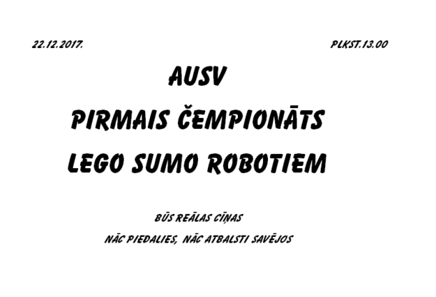 DALĪBNIEKI: AUSV 1. – 9.kl. skolēni. Ar saviem vai robotikas pulciņā konstruētajiem Lego Sumo robotiem.
