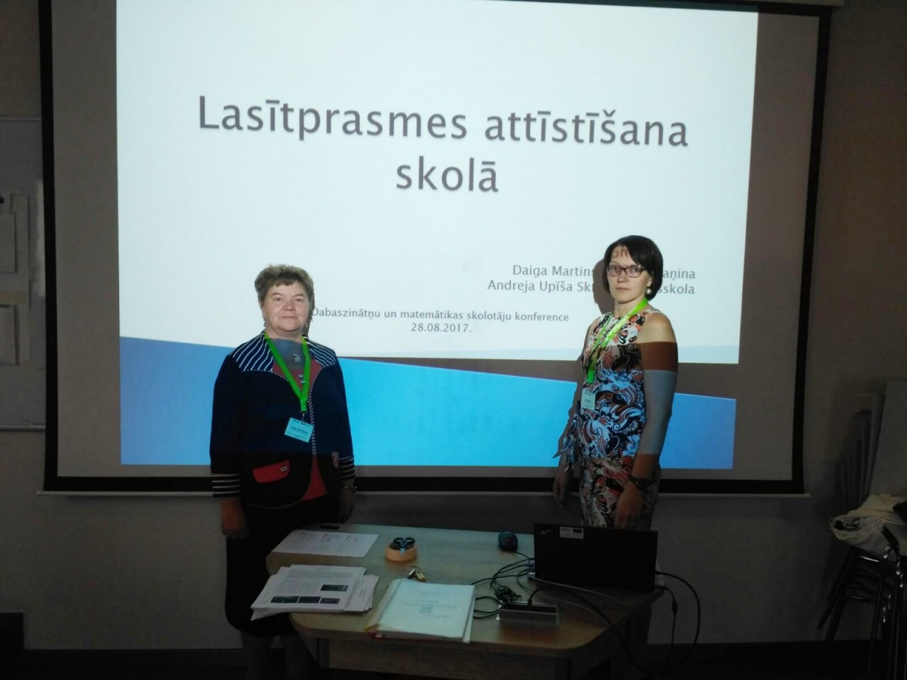 28. augustā dabaszinātņu un matemātikas skolotāji pulcējās ikgadējā konferencē Latvijas universitātē. Šogad ideju tirdziņā piedalījās mūsu ģeogrāfijas skolotāja Ligita Miezīte un dalījās pieredzē par prakstisko darbu vadīšanu ģeogrāfijas stundās. Kas iepriecināja? Skolotāju lielā ieinteresētība un atsaucība, visi izdales materiāli atrada īpašniekus. Savukārt Daiga Martinsone un Ilze Gaņina vadīja radošo darbnīcu par lasītprasmes organizēšanu skolā, prezentējot mūsu skolas pieredzi šajā jomā un sniedzot dažādu uzdevumu paraugus par lasītprasmes attīstīšanu. Arī te sastapāmies ar skolotāju ieinteresētību šajā jomā.