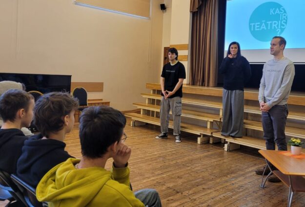 Pirmdien, 10. februārī, skolā viesojās Latvijas Nacionālā teātra aktieri Liene Sebre, Igors Šelegovskis un Kārlis Reijers, lai novadītu teātra mākslas nodarbību “Kas ir teātris?”.