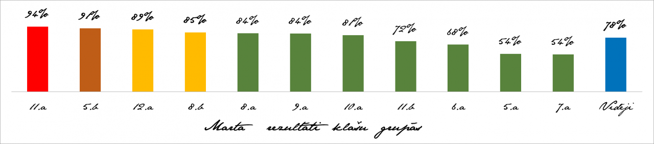 Ir apkopoti marta mēneša aktualitāšu konkursa rezultāti un ar prieku varu paziņot, ka skolas skolēnu sniegums ir atzīstams – vidējais izpeldes rādītājs – šoreiz 78%! Prieks, ka skolēni seko līdzi aktuālajām norisēm Latvijā un pasaulē, tādējādi paplašinot savu redzesloku un izpratni par aktuālajām norisēm. Kā ierasts skolēnu individeuālie rezultāti ir pieejami vēstures kabinetā. Lai veicas arī turpmāk!