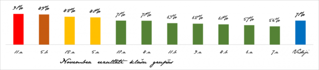 Novembra mēnesī skolēni apliecināja savas zināšanas godam – vidējais izpildes rādītājs ir virs 70%! Vēlos īpaši sumināt tos 62 skolēnus, kas bija īpaši gatavojušies un aizpildījuši konkursa atbilžu lapas, norādot 10 akutalitātes, tādējādi iegūstot 100% izpildes rādītāju. Pārējos klašu rezultātus var redzēt diagrammā, bet skolēnu individuālos rezultātus – vēstures kabinetā!