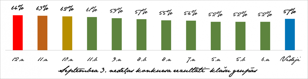 Septembra 3.nedēļas konkursa jautājumi izrādījās gana liels izaicinājums visām klašu grupām, jo vidējais rādītājs 5.-12.klašu grupās ir tikai 57%. Tajā pašā laikā jāuzteic tie 46 skolēni, kas ir izpildījuši konkursa uzdevumus un ieguvuši vairāk vairāk kā 7% izpildes rādītāju! Apsveicam šīs nedēļas konkursa uzvarētājus! Lai veicas arī turpmāk!