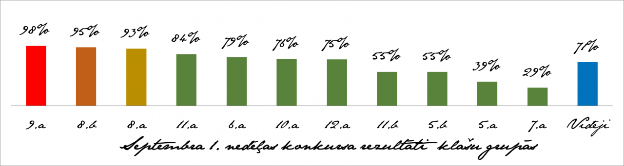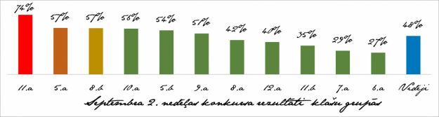 Ir apkopoti septembra 1. un 2. nedēļas rezultāti un tie ir iepriecinoši, kā arī iezīmē interesantu tendenci – ja skolēniem pašiem jāraksta 10 aktualitātes (septembra 1.konkurss), rezultāti ir augstāki kā nedēļā, kad tiek piedāvāts atbildēt jau uz sagatavotiem jautājumiem (septembra 2.konkurss). Tāpat patīkami ir redzēt, ka jau 1. un 2.konkursā ir skolēni, kas spēja apliecināt savas zināšanas 100% apjomā – 1.nedēļas konkursā – 76, bet 2.nedēļas konkursā – 6! Apsveicu uzvarētājus klašu sacensībās 1. un 2. konkursā (skat. diagrammas) un vēlu veiksmi visa mācību gada garumā!