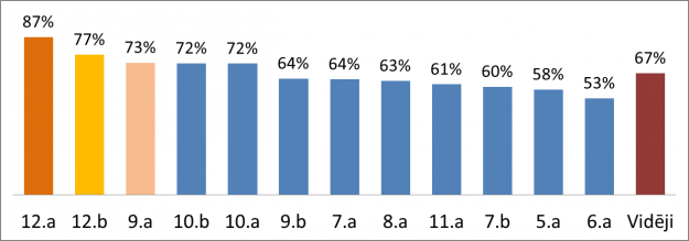 Februāra konkursā skolēni ir uzrādījuši tik tiešām atzīstamus rezultātus, jo visiem 6.-12.klašu skolēniem vidējais rezultāts ir virs 40%. Tas nozīmē, ka varam būt gandarīti par skolēnu intereses intensitātes līmeņa paaugstināšanos par aktuālajām norisēm Latvijā un pasaulē. Klašu sasniegumi redzami diagrammā!