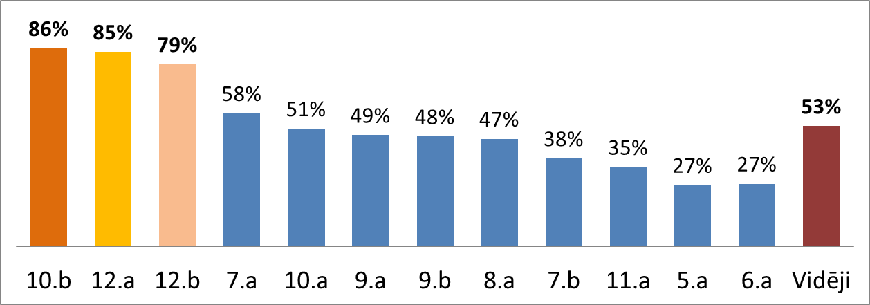 Janvāra 4.nedēļas konkursā skolēnu zināšanas tika pārbaudītas aktuālajās norisēs ekonomikas, poltikas un kultūras jomās. Prieks, ka visi skolēni, kuri piedalījās, atbildēja uz jautājumu, kādam notikumam notika 25 gadu atcere – Barikāžu laika notikumiem. Apsveicu 12.a klasi ar 1. vietu, tāpat jāuzslavē 10.a un 9.a klašu skolēni! Pārējie rezultāti ir redzami diagrammā!
