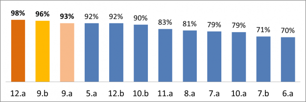 Decembra konkursā 5.-12. klašu skolēni kā ierasts apliecināja savu erudīciju aktuālajās norisēs Latvijā un pasaulē. Rezultāti tik tiešām iepriecina, jo vidējais rādītājs skolā ir 85% (robežās no 70% līdz 98%). Jāizceļ 27 skolēni, kuri sasniedza maksimālo – 100% izpildes rādītāju! II semestrī turpināsim konkursu ierastajā manierē, lai maijā noskaidrotu 6 erudītākos skolēnus, kuri dosies apmaksātā mācību ekskursijā uz Eiropas Parlamentu Briselē! Klašu sasniegumi redzami diagrammā!