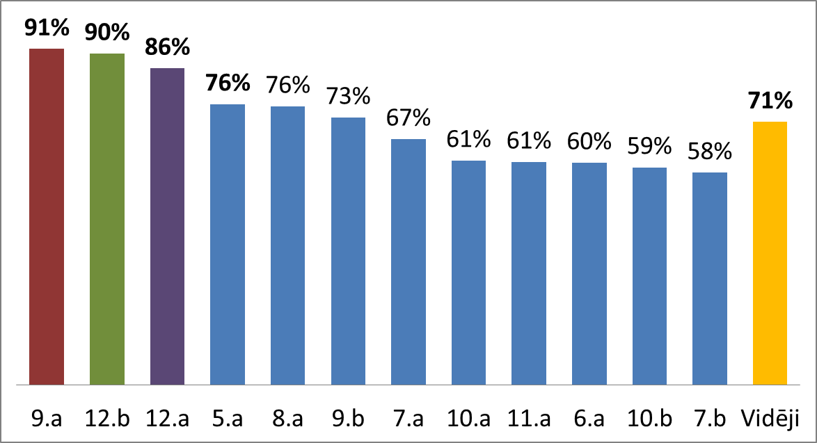 Atskatoties uz oktobra 2.nedēļas konkursu, redzam, ka ir izteikts līderis klašu sacensībās – 9.a klase ar 91% izpildes rādītāju! Jāuzteic arī 33% skolēnu, kuri ir sasnieguši maksimālo – 100% izpildes rādītāju. Šajā konkursā skolēniem tika lūgts pašiem uzrakstīt 10 aktualitātes un, kā redzams pēc vidējā izpildes rādītāja skolā, rezultāti ir tikai un vienīgi apsveicami! Savukārt sveiciens pašiem mazākajiem – 5.a klasei, kura šajā kārtā izcīnijā godpilno atzinību! Paldies par palīdzību šīs konkursa kārtas īstenošanā kolēģiem A.Miškai, I.Dikai, I.Gaņinai, R.Skrimblei un S.Rūzei. Klašu rezultāti redzami diagrammā!