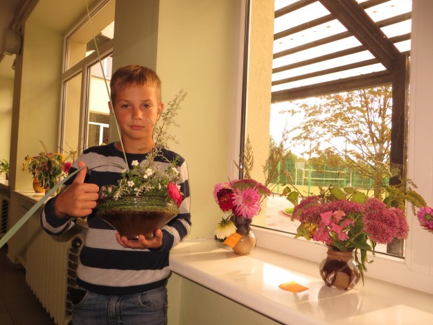 Otrdien, tieši Miķeļdienā, ceturto klašu skolēniem bija mājturības stunda. Un uz šo stundu mums bija jāatnes ziedi, augi, vāzes. No skaistajiem rudens ziediem mēs veidojām ziedu kompozīcijas vāzēs. Tur ielikām dālijas, miķelītes, gladiolas, saulespuķes un citus ziedus. Arī skolotājas nedaudz mums palīdzēja. Ziedus mēs novietojām gan zālē, gan uz palodzēm. Šos kārtojumus mēs veltām skolotājām un skolotājiem Skolotāju dienā.