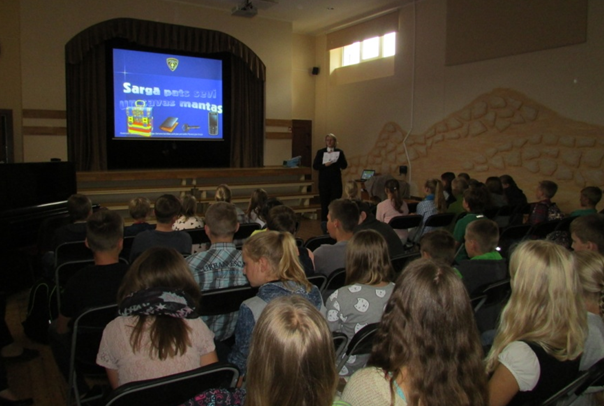Pirmdien, 8.septembrī, 5.-8. klašu skolēni pulcējās skolas aktu zālē, lai satiktos ar policisti, kura atgādināja par mūsu drošību un noteikumiem, kas jāievēro, lai sevi pasargātu. Mums tika parādītas vairākas prezentācijas, kuras tika runāts par drošību ikdienā, tāpat arī par vardarbību skolās.