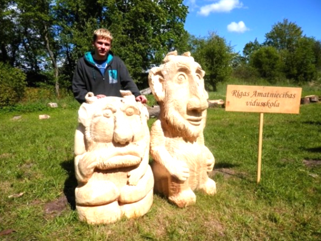 Latvijas Amatniecības kameru plenērā Kuldīgā tapuši pasaku tēli — koka skulptūras, kuras dāvinās Bērnu slimnīcai Rīgā. Turp ceļos vairāku Somijas un Latvijas topošo galdnieku darbi, arī skrīverieša Alvja Krasovska, Rīgas Amatniecības vidusskolas audzēkņa, darinātais velniņš.