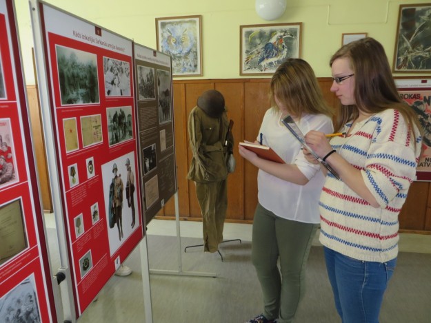 No 7. līdz 15.maijam skolā būs skatāma Okupācijas muzeja sagatavotā ceļojošā izstāde “Rokas nost no Latvijas”, kurā sniegts ieskats latviešu likteņos II Pasaules kara laikā, kad tie tika mobilizēti PSRS un Nacistiskās Vācijas armijās. Izstādi papildina materiālās liecības (prese, orģināla Sarkanās armijas kareivja uniforma, lādiņu čaulītes, prese utt.) par kareivju dzīvi kara laikā, kas novietota līdzās izstādei. 12.klases skolniece A.Strazdiņa uzsver: “Vairāki tūkstoši karavīru tika mobilizēti, lai cīnītos vienos vai otros spēkos. Ilgas pēc mājām, cerība par labāku dzīvi un mīļoto cilvēku atkal satikšanos – tādas domas klejoja ap ikvienu latvju vīru nu jau gandrīz pirms 80 gadiem. Cik ļoti situācija mūsdienās ir uzlabojusies? Vai mēs spējam to novērtēt? Izstādē meklējām informāciju, lasījām, analizējām un daudz iemācījāmies. Par vēstures avotiem kalpoja izkārtnes ar dažādām fotogrāfijām, piezīmēm, cilvēku stāstiem, vēstulēm, dokumentiem, kā arī dažādi laikraksti. Bija iespējams arī apskatīties uz īstu to laiku kareivju uniformu. Lielāku priekšstatu par situāciju tālajā 1941./1942. gadā palīdzēja gūt mūsu vēstures skolotājs Edgars Bērziņš.” Vēstures stundās izstādi apmeklēs 6.-12.klašu skolēni, savukārt 1.-5.klašu skolēni izstādi apmeklēs pēc pašu vai skolotāju iniciatīvas. Foto atskats pieejams GALERIJĀ