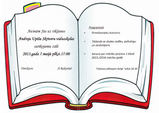 2015.gada 7.maijā plkst. 17.00 topošo pirmklasnieku vecāki aicināti uz topošo pirmklasnieku pasākumu. Pasākuma laikā ameklētājus priecēs pirmklasnieku koncerts, tāpat būs iespēja tikties ar skolas vadību, psihologu un skolotājiem, kā arī iepazīties ar aktuālo informāciju un uzzināt atbildes uz jautājumiem par mācību procesu 1.klasē 2015./2016.mācību gadā. Inese Uzula, direktora vietniece mācību darbā uzsver: “Tikšanās laikā būs iespēja iepazīties ar svarīgāko par mācībām 1.klasē un tikties ar topošo pirmo klašu audzinātājām – tie ir divi būtiski iemesli, kādēļ apmeklēt šo pasākumu!”