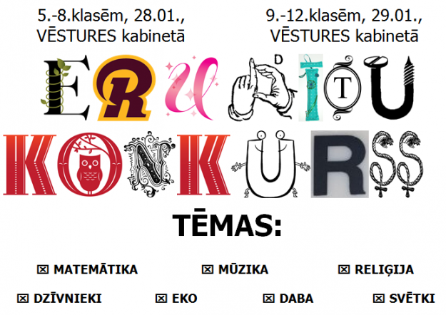 Erudītu konkurss 5.-8.klašu skolēniem notiks 28.01.2015. pl.15.30, bet 9.-12.klašu skolēniem – 29.01.2015. pl.15.30 vēstures kabinetā! Konkursā var piedalīties no katras klases viena skolēnu komanda četru cilvēku sastāvā (izņēmums – 7.klase ar divām komandām).
