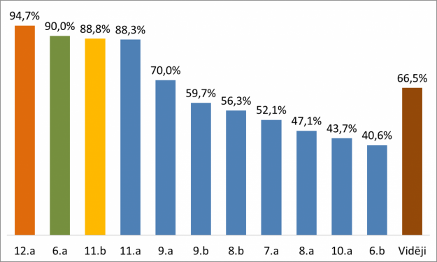 Aizvadīts pirmais aktualitāšu konkurss 2014./2015.mācību gada II semestrī. Šajā konkursā skolēniem tika piedāvāts atbildēt uz jautājumiem par 2014.gada spilgtākajiem notikumiem politikā, ekonomikā, kultūrā, sportā un citās jomās kā Latvijā, tā ārzemēs. Šī konkursa maksimālais iespējamais punktu skaits: 36 punkti. Rezultāti ir iepriecinoši: no 174 konkursa dalībniekiem 23 jeb 13% skolēnu ir izpildījuši konkursa darbu 100% precīzi, tajā pašā laikā jāatzīmē, ka 31 jeb 18% skolēnu nav uzrādījuši augstāku zināšanu rādītāju par 30%. Līdz ar to var secināt, ka ir, kur augt! Silti sveicieni TOP3 vietu ieguvējiem: 1.vieta – 12.a klasei (izpilde – 94,7%), 2.vieta – 6.a klasei (90,0%) un 3.vieta – 11.b klasei (88,8%)! Jāatzīmē, ka 11.a klasei – atzinība un tikai pat 5% mazāk kā 3.vietas ieguvējiem! Kopējie rezultāti redzami diagrammā, bet konkursa jautājumi – zemāk!