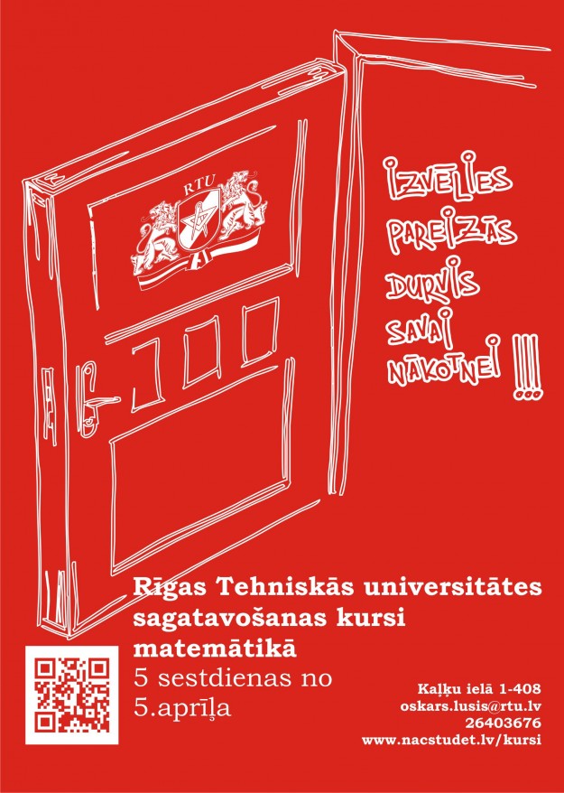 RTU 5.aprīlī sāksies šī mācību gada pēdējie matemātikas sagatavošanas kursi. Sīkāk pielikumā un mājas lapā www.nacstudet.lv/kursi