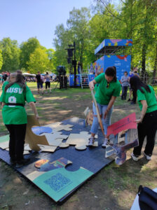 Kā pirmo veicām kāpienu klinšu sienā, tad sekoja stafešu uzdevumi: uzvelkot speciālas piepūšamās bumbas, bija tās jāizripina pa noteikto maršrutu uz ātrumu. Tad sekoja stafete, kurā bija jāpārvar dažādi šķēršļi un jāatbild uz jautājumiem par atkritumu šķirošanu.